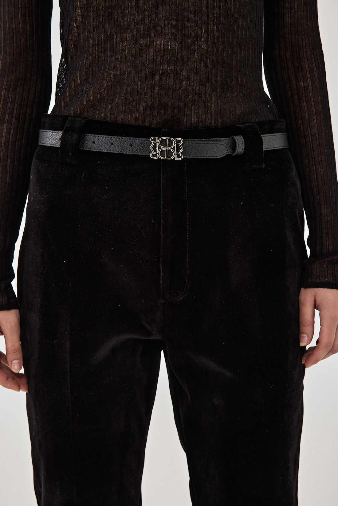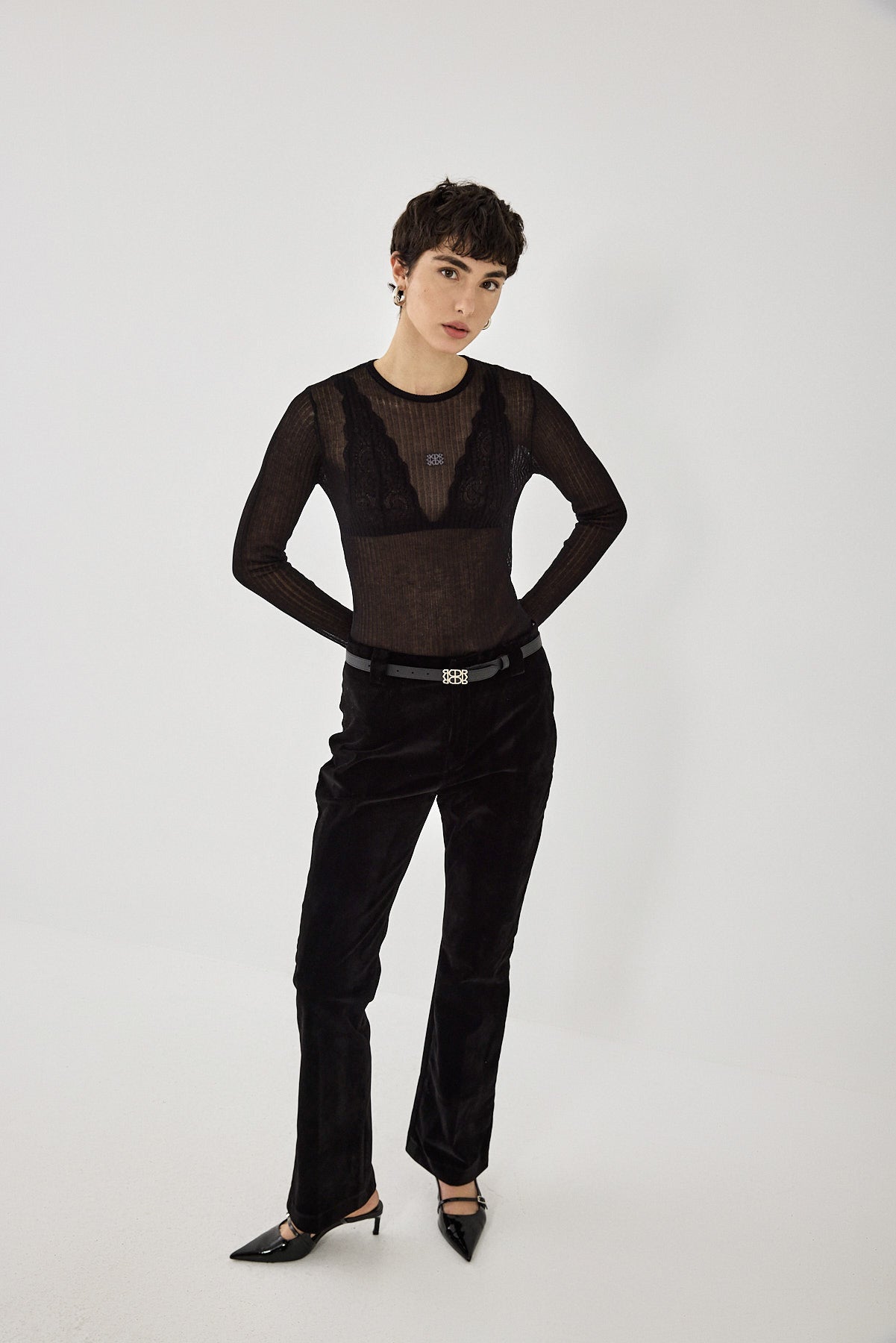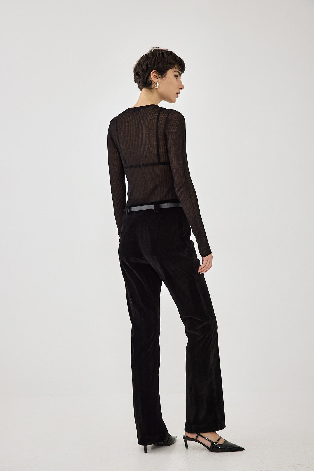 The ultra-chic bootcut silhouette in an elegant fabric material. Rigid velvet. High waisted tailored pants with a bootcut silhouette. Full length. Featuring wide belt loops. Front zip and metal hook closure. Embroidered logo detailing at the back. Style it with our sheer top, the velvet oversized blazer and a kitten heel for a perfect look for date night.
