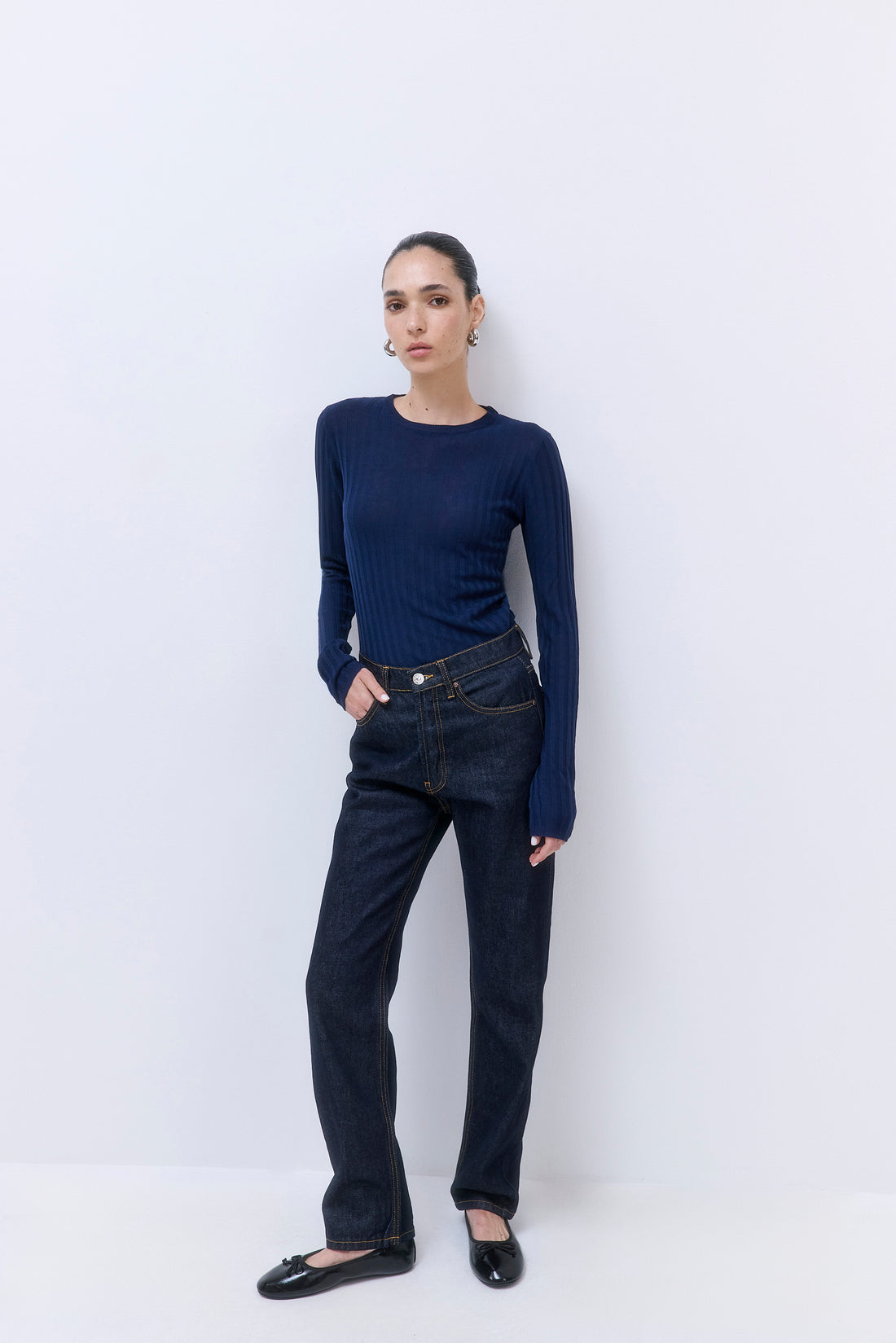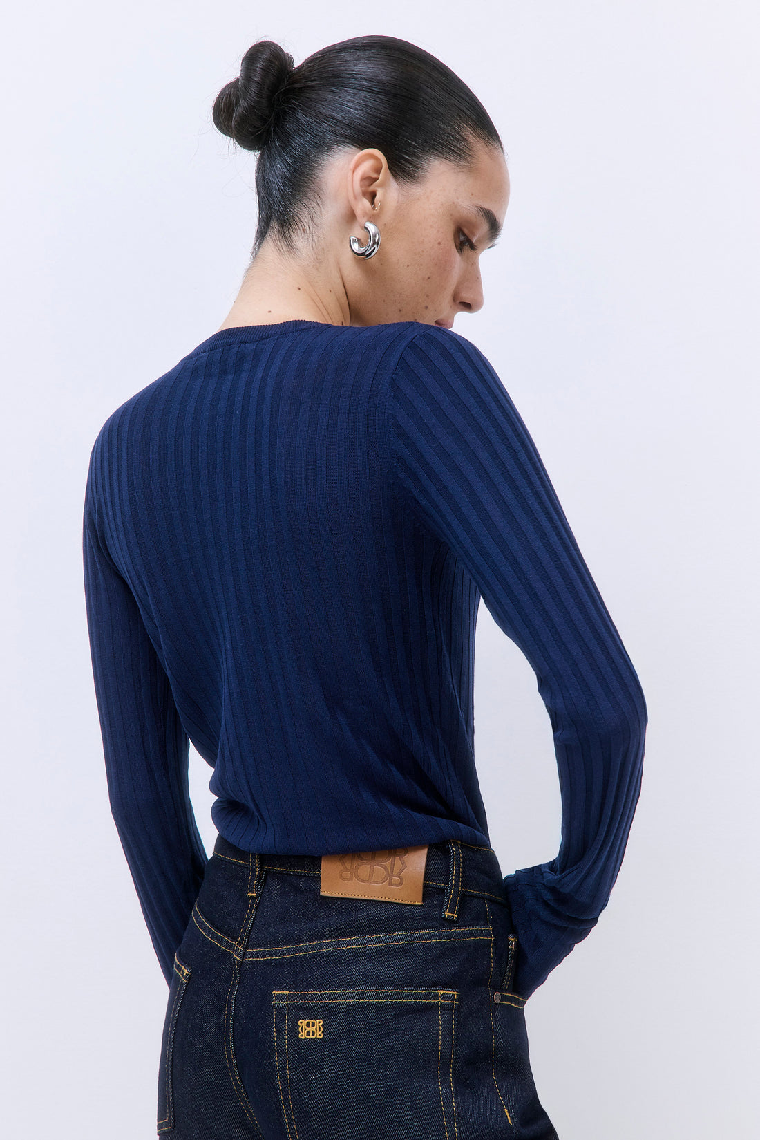 A staple piece for every capsule wardrobe. Ribbed crew neckline. Ribbed finish. Slim fit. Full length. Fully fashioned. Clean finishes. Pair it with our stylish Micro Mini Skirt and our sleek Rodika Tote Bag for an everyday effortless look.