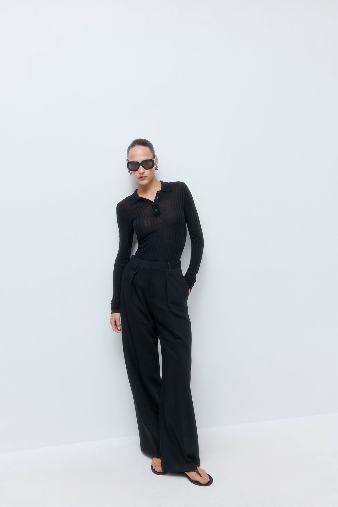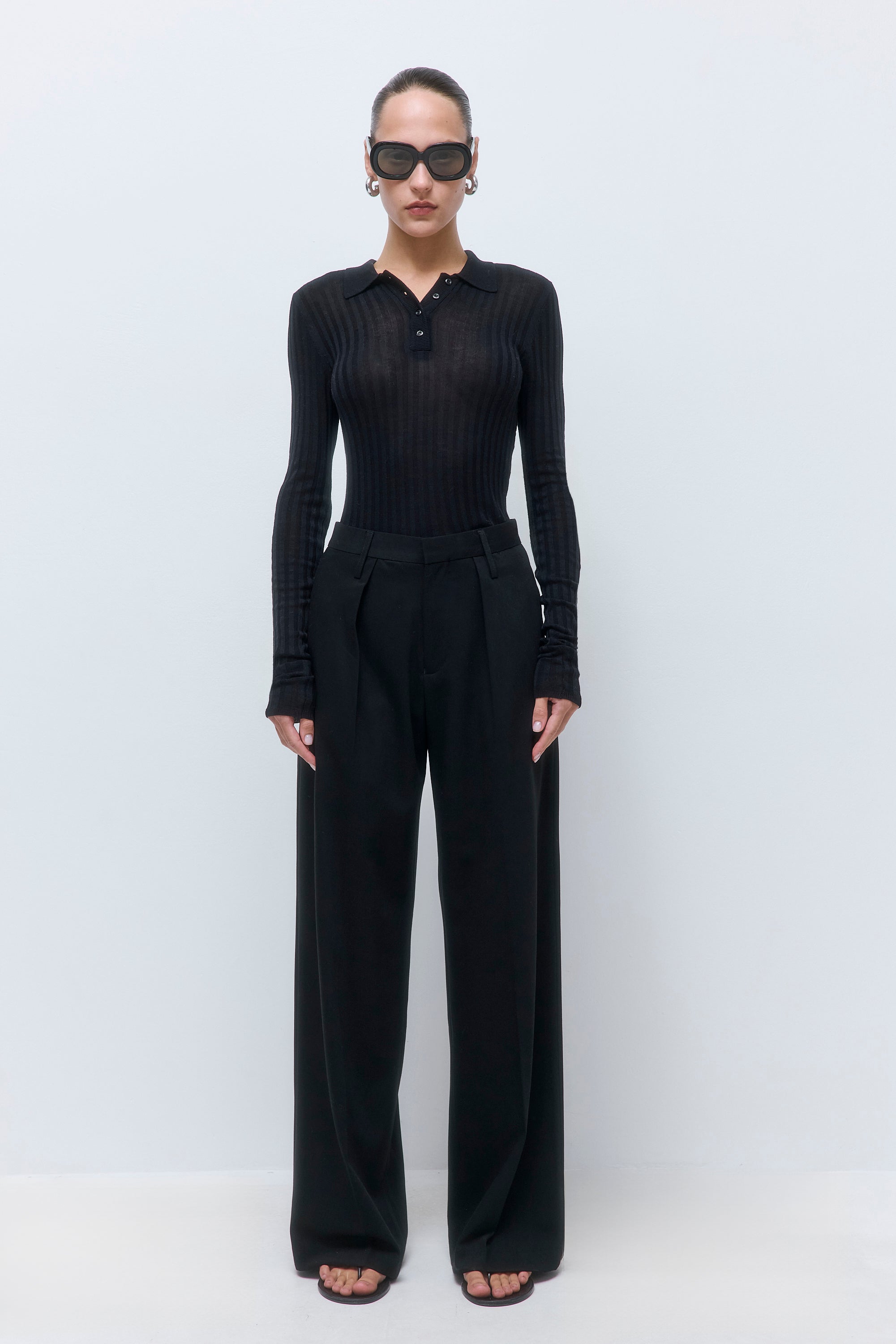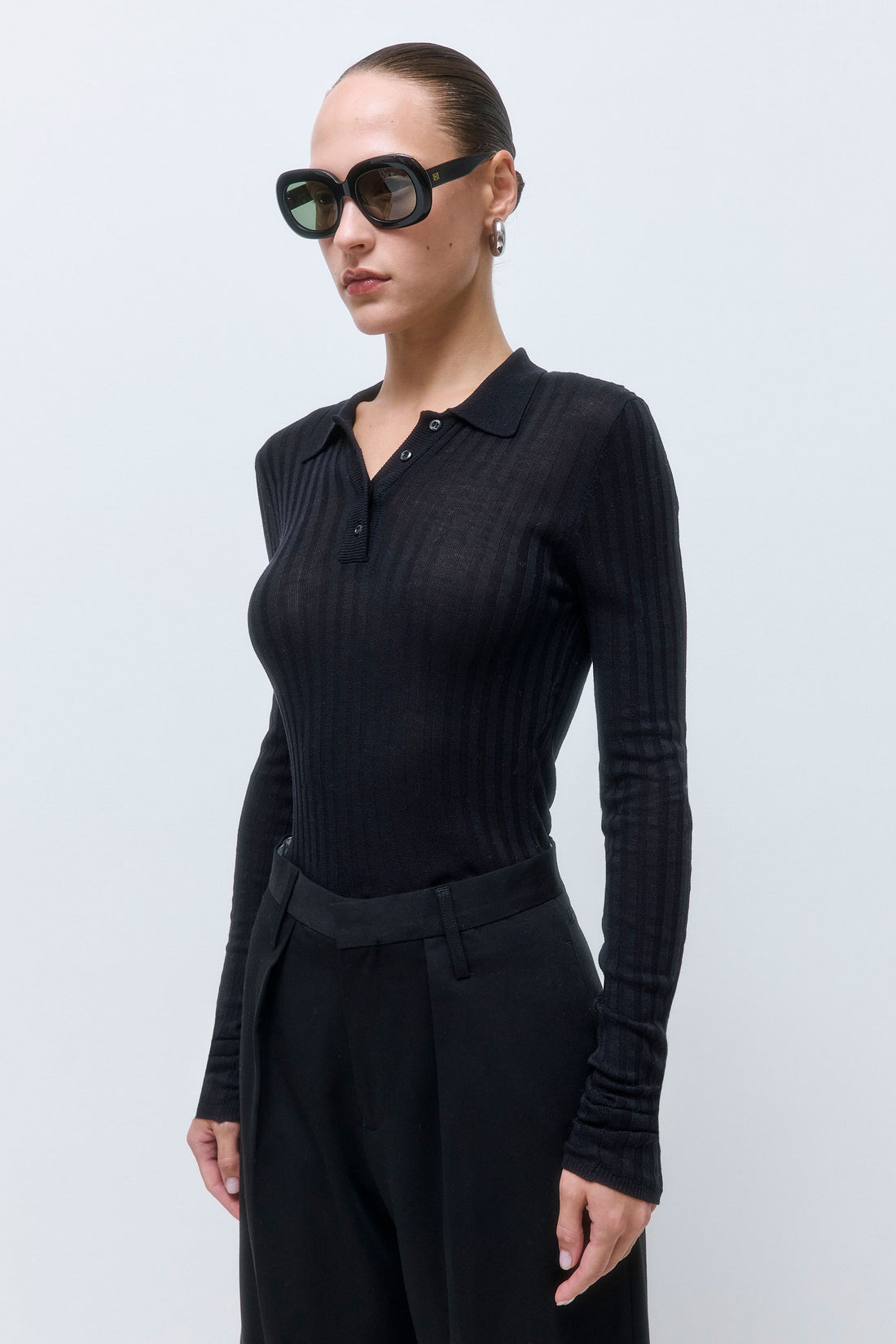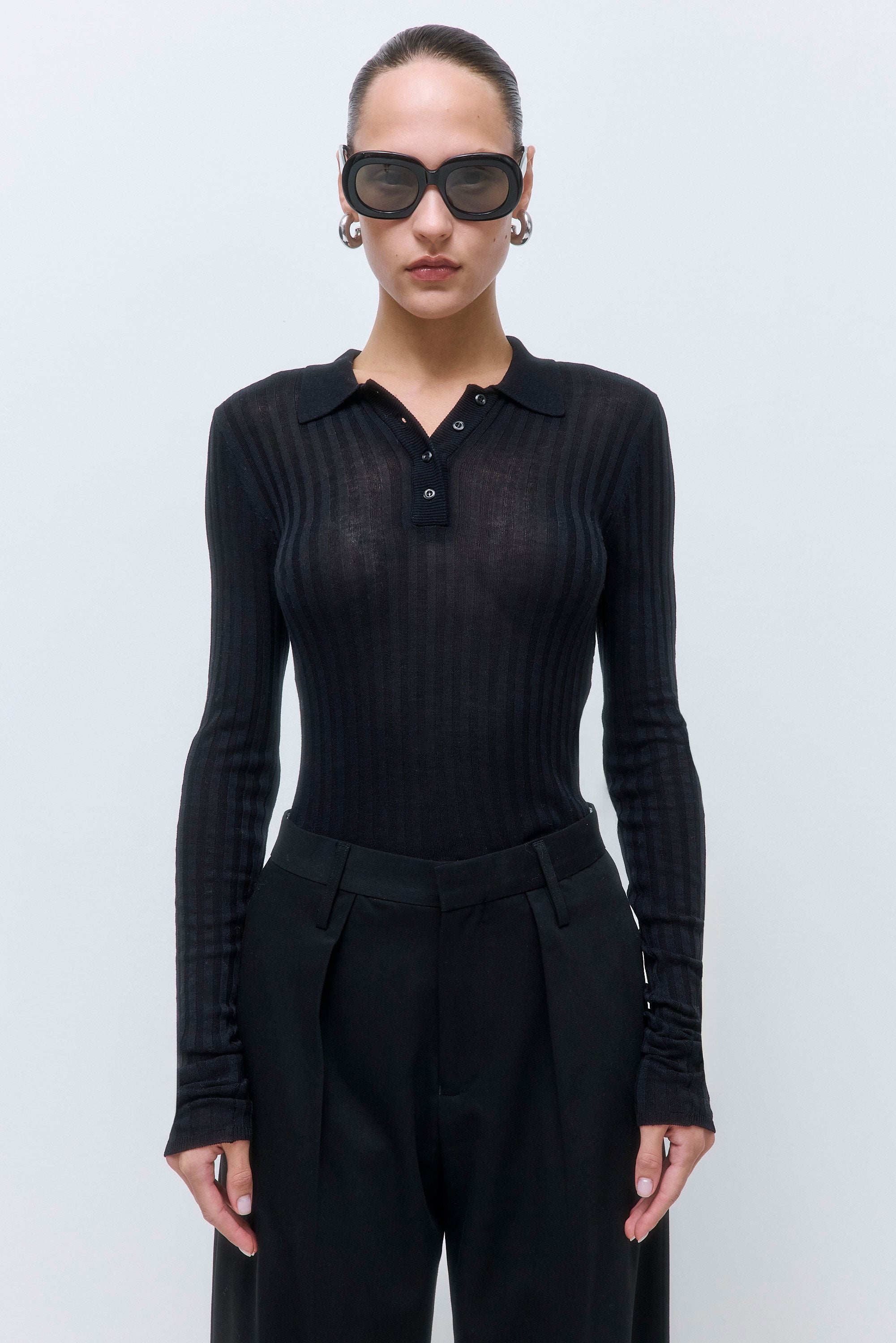 A staple piece for every capsule wardrobe. Polo neckline. Features 4 tonal buttons. Ribbed finish. Slim fit. Full length. Fully fashioned. Clean finishes. Pair it with our stylish Micro Mini Skirt and our sleek Rodika Tote Bag for an everyday effortless look.