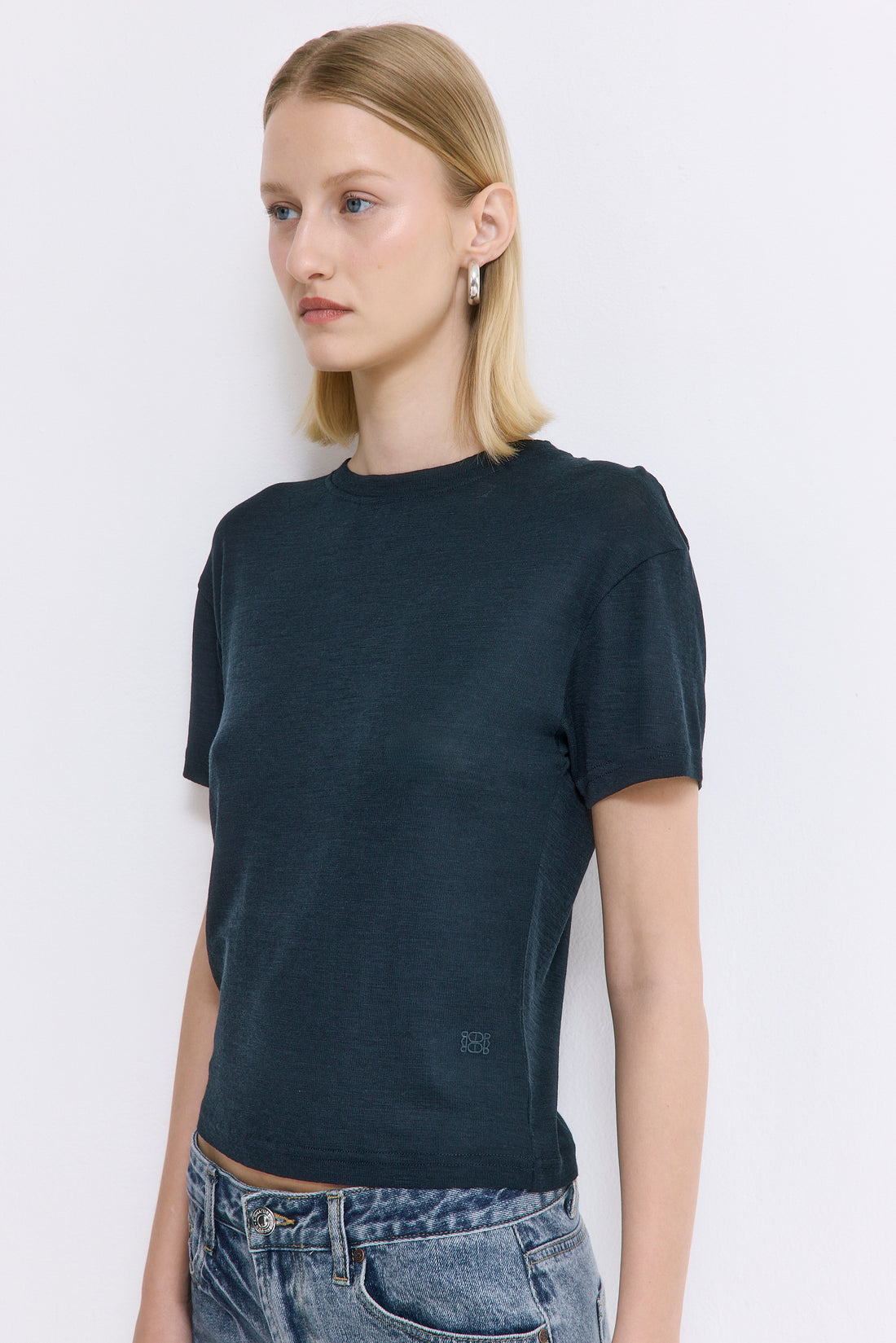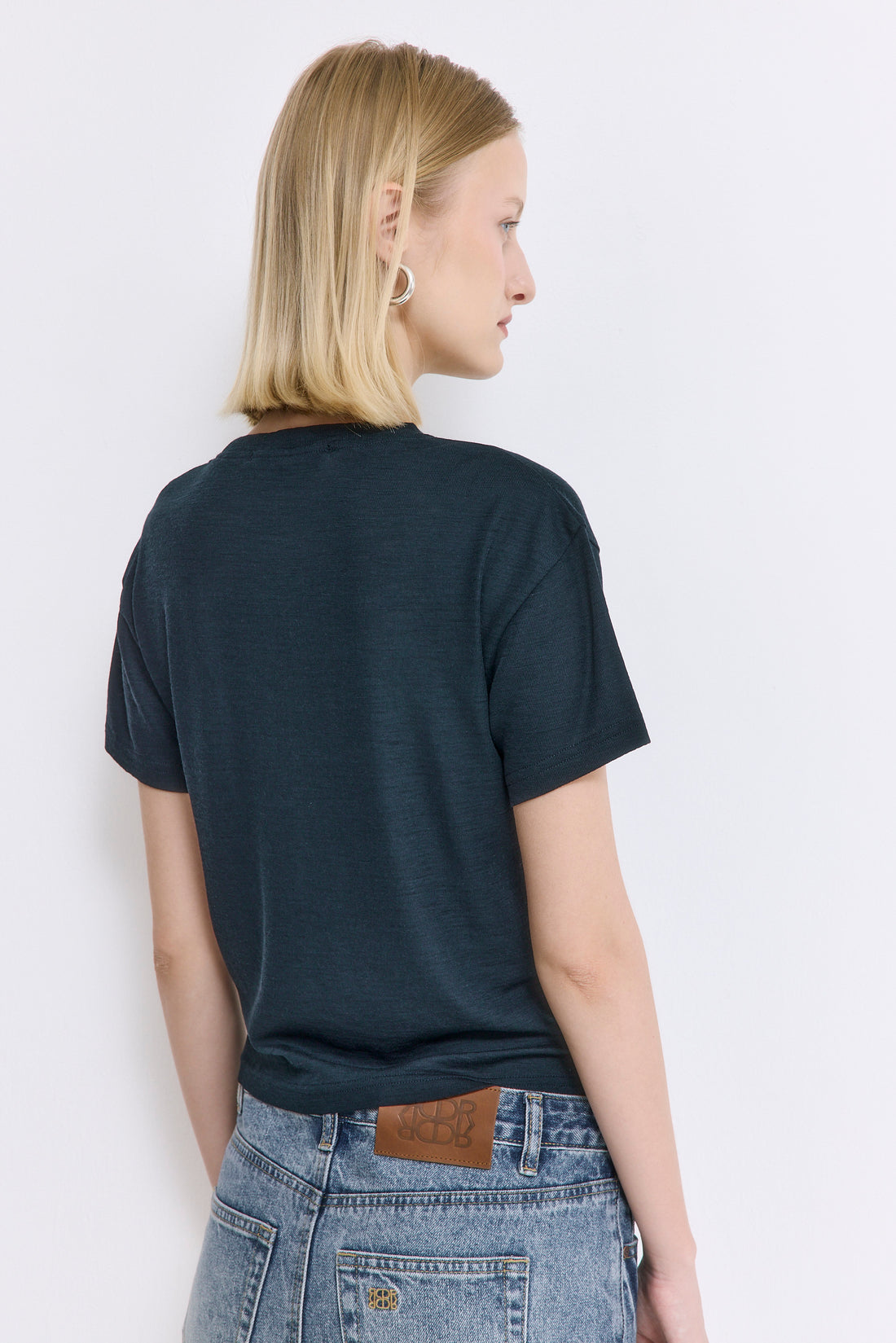 Our basic wool t shirt is the softest top you'll own. Made from ultra-light, breathable wool that regulates temperature and wicks moisture — keeping you cool, dry, and effortlessly chic all season long. Crew neckline. Short Sleeved. Relaxed fit. Tonal logo embroidered on the side. Style it with our perfect wide leg cotton pants, our beautiful Rodika bag and finish the look with our timeless oval sunnies.