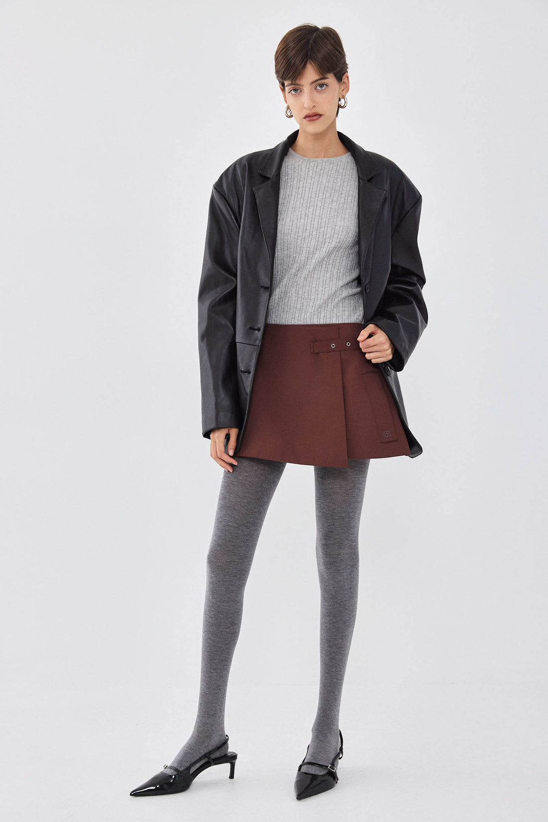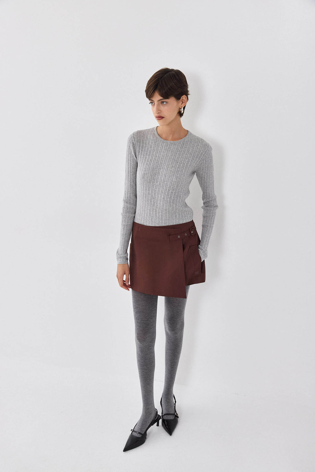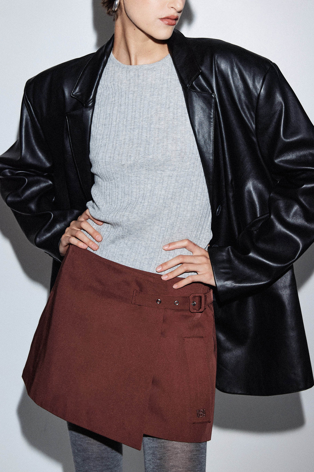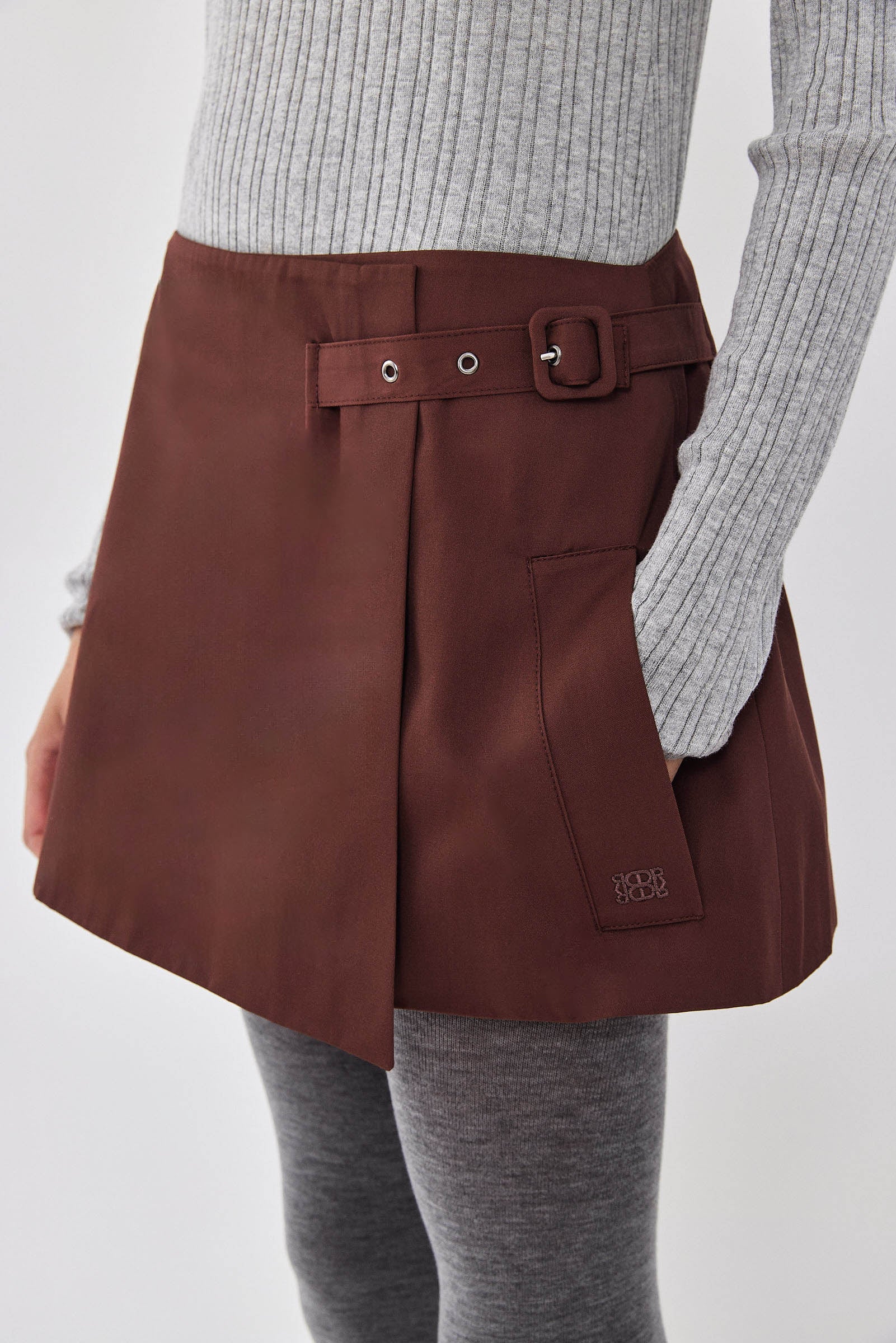 Ready for any occasion, our wrap mini skirt brings a dose of elegance and charm. Lined. Two side pockets. Adjustable strap for both high and mid waist. Tonal embroidered logo on the pocket. A-line fit. Style it with our matching cropped trench coat, our long sleeved ribbed knit and a pair of our oval sunglasses for a classy and chic look.
